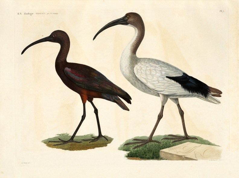 2021 Edit: The print Oiseaux of the two ibises below is not by Alexander Wilson. The glossy ibis on the left is by Pierre-Joseph Redoute. The white one on the right is by Jacques Barraband. The print is from a book commissioned by Napoleon and is a compendium on the birds of Egypt. The book was authored by Jules-Cesar Savigny (1777-1851) and is called Description de l’Egypte, ou Recueil des observations et des recherches qui ont ete faites en Egypte pendant l’Expedition de l’Armee francaise, (Paris, 1809-1830). The book, (Description of Egypt in English), documents Napoleon’s (1769-1821) military and scientific expedition to Egypt in 1798.