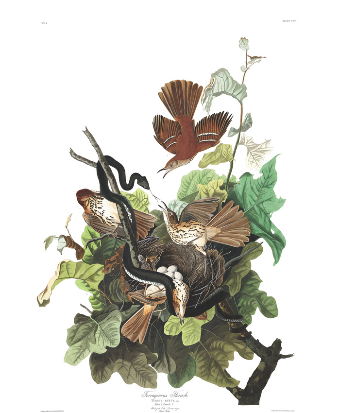 When painting some nests, Audubon added drama, wherein hungry snakes scaled branches and limbs to feast on eggs and birds alike. These depictions of realistic predation were also unprecedented, and they captured animal behavior in ways no other naturalist had before. In the print below, and eastern rat snake raids a brown thrasher nest.