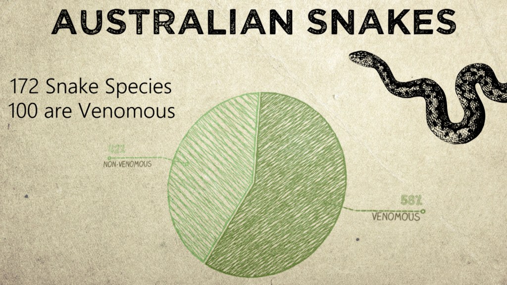 Now, let’s take a look at snakes in Australia. Australia has a LOT of venomous snake species, and some of them even live in the ocean. Out of Australia’s 172 snakes species, 100 of them are venomous. although only a dozen pack venom deadly enough to kill humans.
