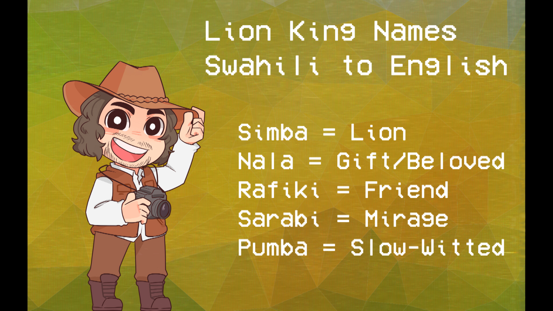 (As an aside, pretty much all of the Lion King’s characters have Swahili names, which is a popular language spoken in Tanzania and the surrounding countries in southwest Africa. But Swahili is not spoken in Namibia or Botswana, so make of that what you will.)
