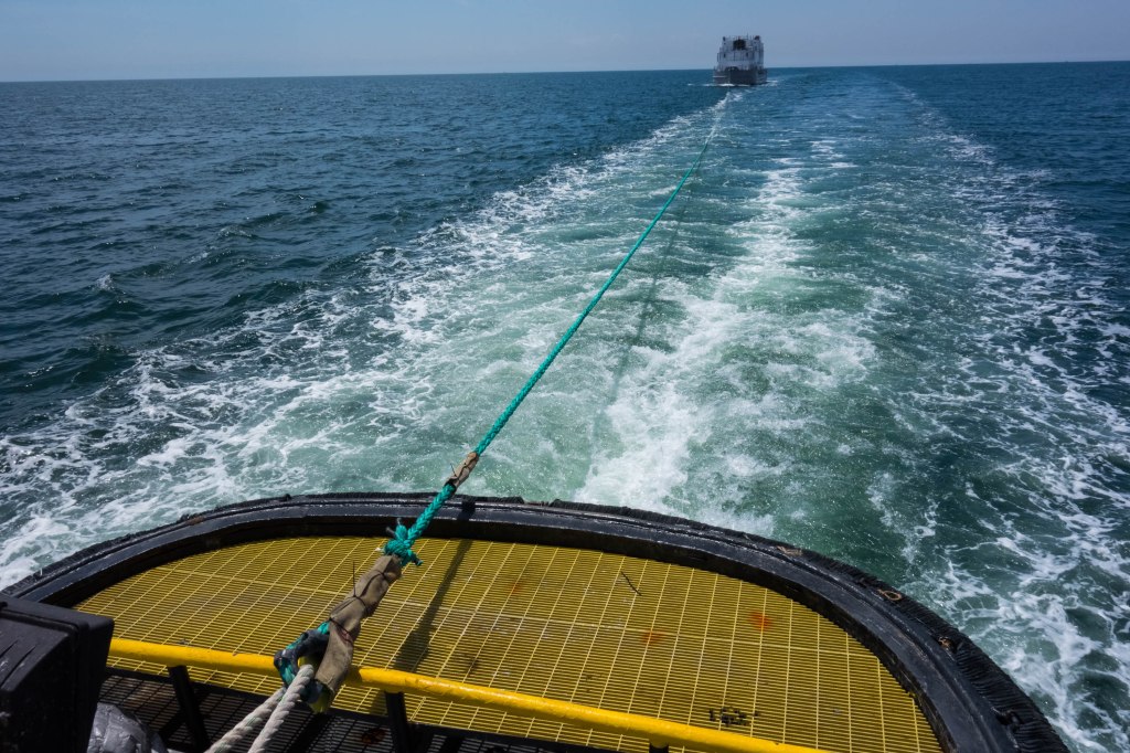 We picked up the naval barracks barge somewhere in the Elizabeth River. (I forget exactly where, but it’s not plot relevant.) We towed her on the hip until we had crossed over the Chesapeake Bay Bridge-Tunnel and entered the Atlantic Ocean. There, we had to release the barge from the tugboat’s waist and tow it behind us.