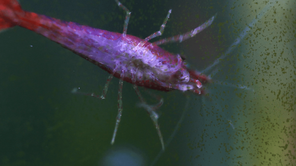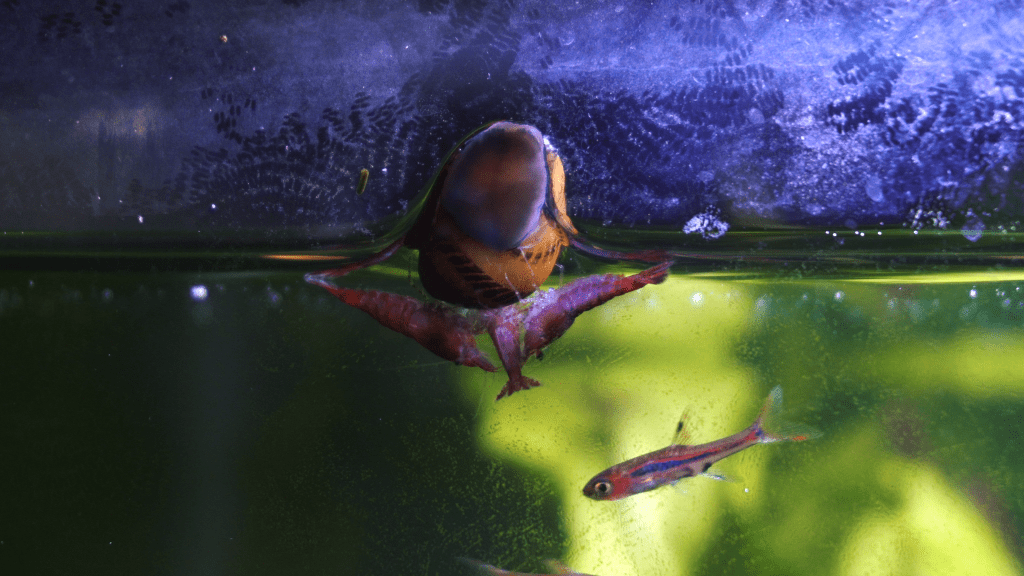 This little guy is a cherry shrimp. Up close, you can see the shrimp’s shrimpy features. See those pulsing featherlike organs? Those are the shrimp’s gills. You can also see the shrimp’s legs and swimmerettes. Like crabs and lobsters, shrimp are decapods, which is Greek for “ten feet”, and they have 10 legs. On their forward legs, they have tiny claws that they use to collect algae and biofilm.