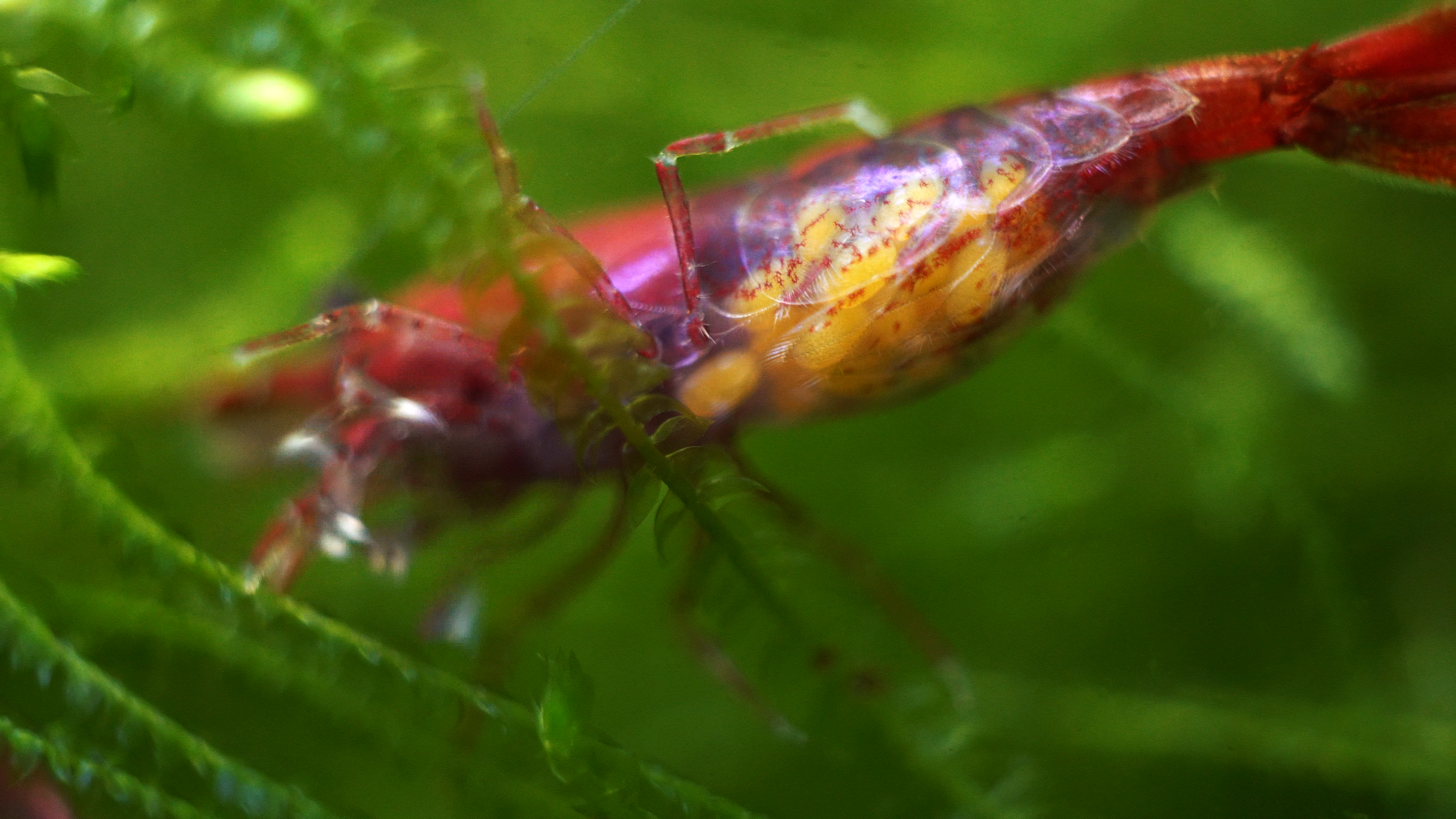 But let me ask you this: have you ever seen a pregnant shrimp? Well, this is what one looks like. You see those yellow orbs attached to her swimmerettes? Those are the eggs. After a few weeks, they’ll hatch into tiny baby shrimplets and keep the shrimp population going. It’s really cool watching the circle of life in this miniature ecosystem.