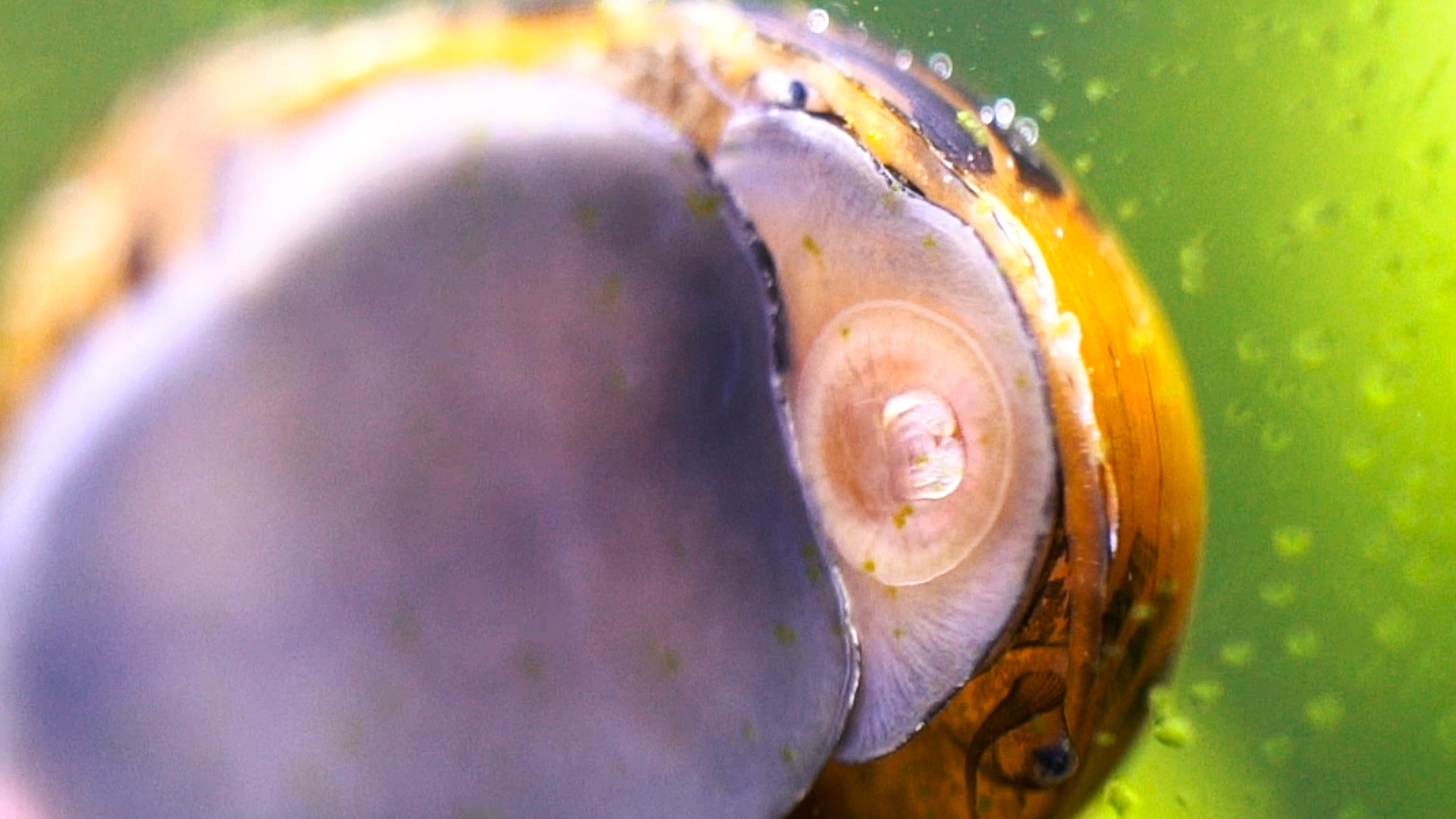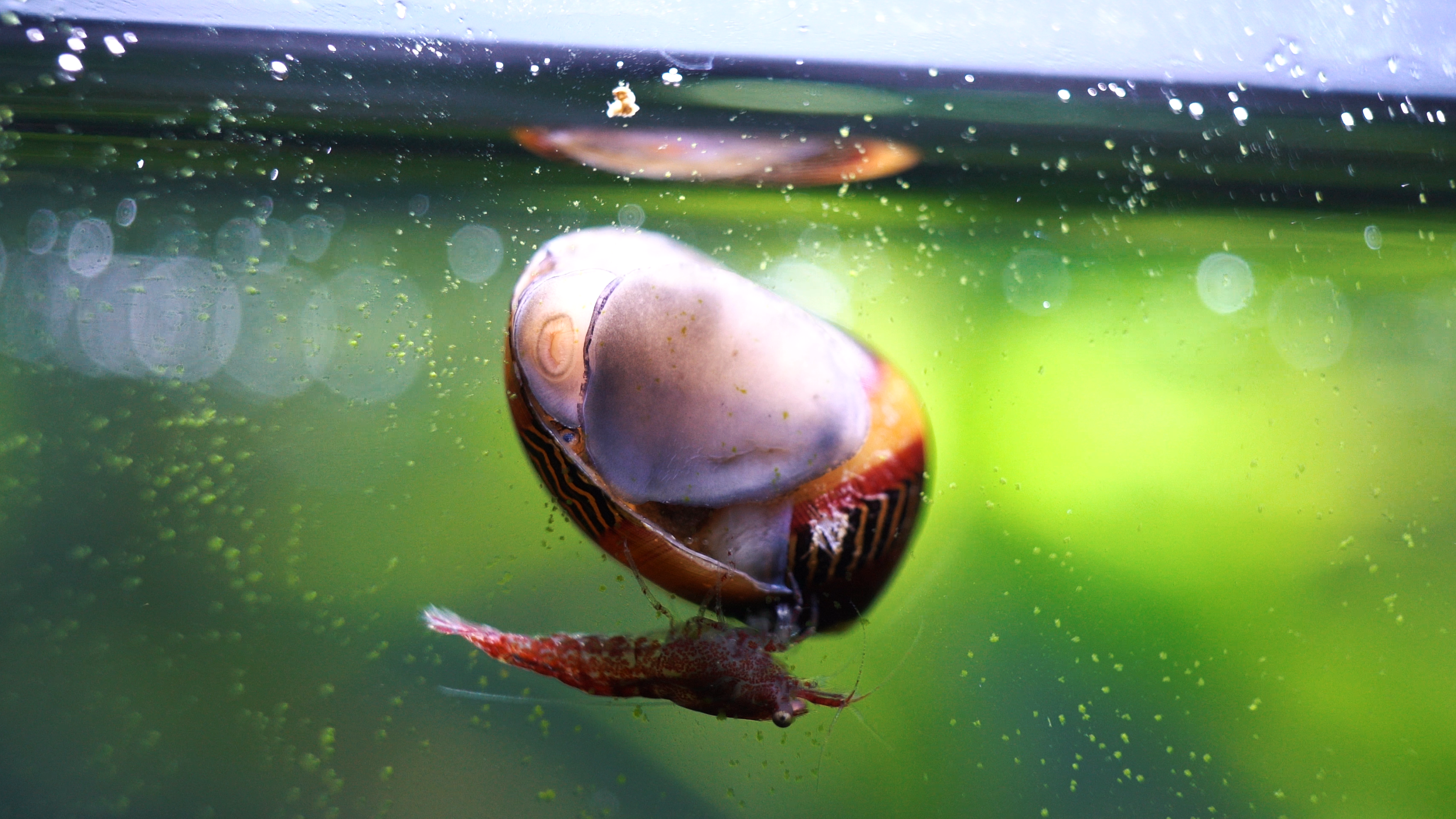 Meanwhile, the red racer nerite snails truly live up to their name. They race around the tank, slurping up algae and decaying plant matter. Here, you can see how they scoop up algae with their mouth. Inside their mouth, they have this tongue-like organ called a radula, and its covered with tiny teeth that scrape up food.