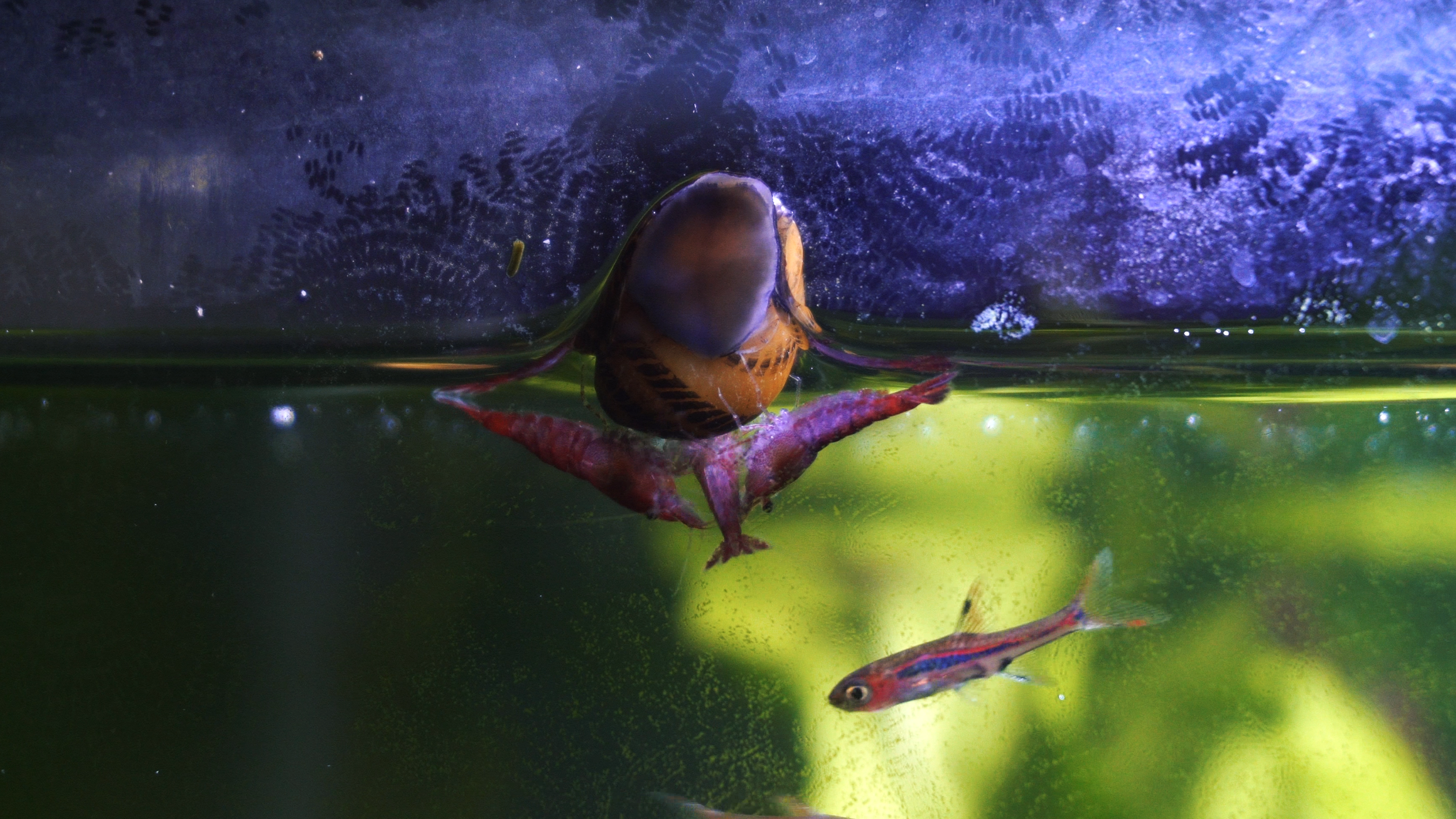 This little guy is a cherry shrimp. Up close, you can see the shrimp’s shrimpy features. See those pulsing featherlike organs? Those are the shrimp’s gills. You can also see the shrimp’s legs and swimmerettes. Like crabs and lobsters, shrimp are decapods, which is Greek for “ten feet”, and they have 10 legs. On their forward legs, they have tiny claws that they use to collect algae and biofilm.