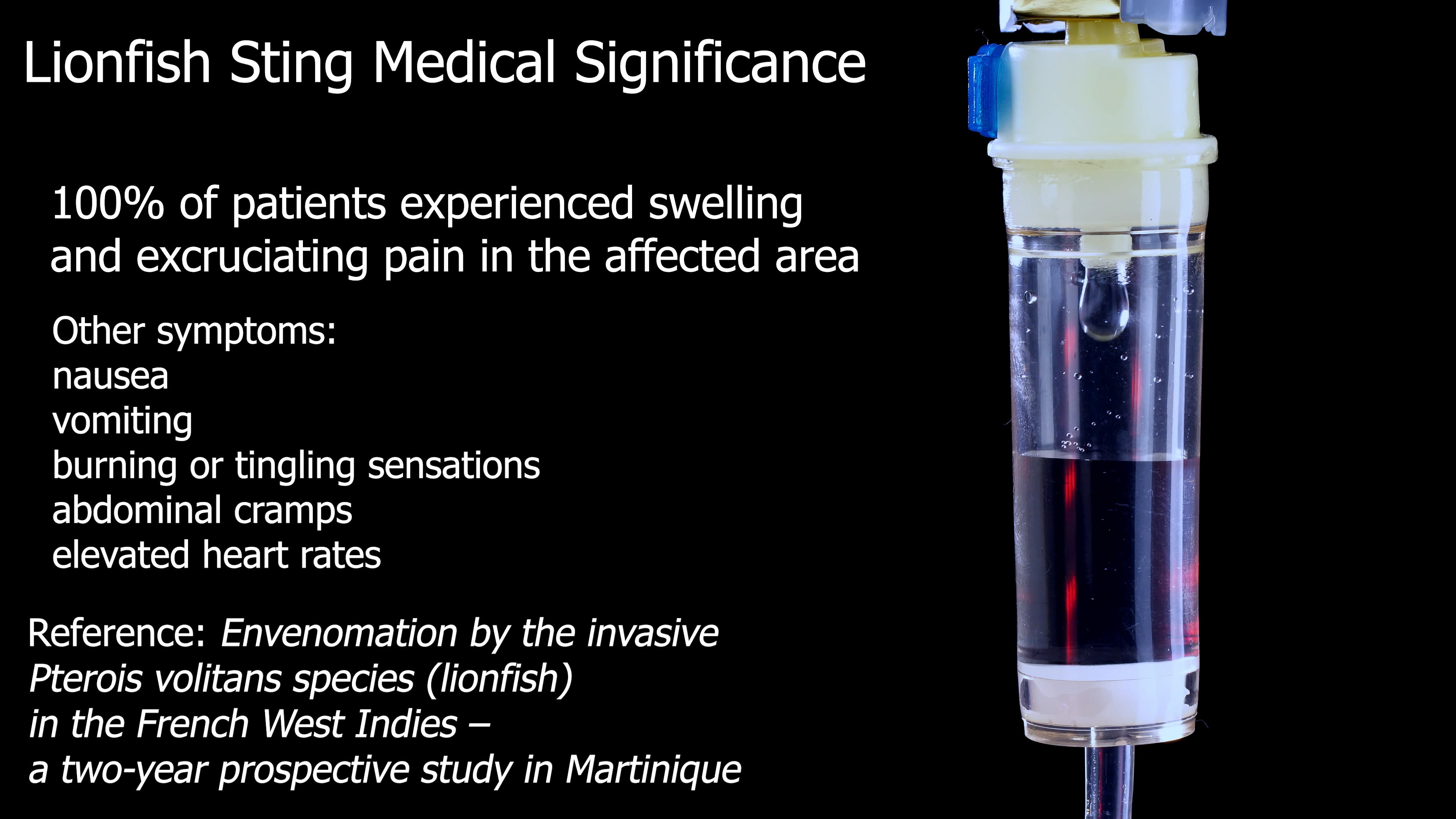 Thankfully, there are no documented reports of fatalities from lionfish stings, but getting stung by one is still not a pleasant experience. In a 2016 study of 117 lionfish sting patients, 100% of them experienced swelling and excruciating pain in the affected area. Other symptoms include nausea, vomiting, burning or tingling sensations, abdominal cramps, and elevated heart rates. In the most severe cases, patients experienced anaphylaxis, limb paralysis, and cardiac failure.