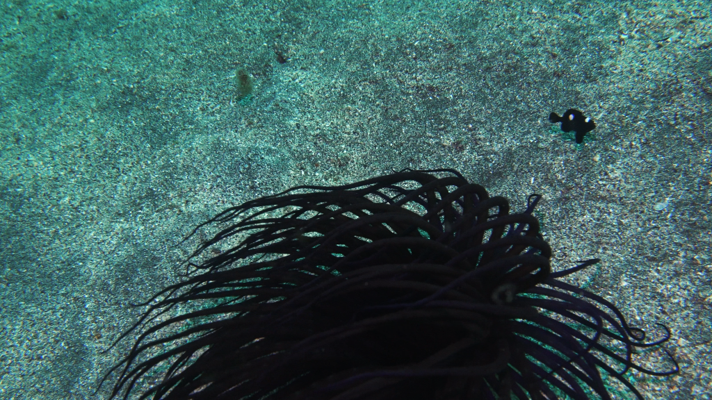 Down on the reef, we found these little guys. Known as the threespot dascyllus, they look like the soot creatures from Spirited Away. These ones are practically babies, so they’re still quite small and take refuge within coral and sea anemones.