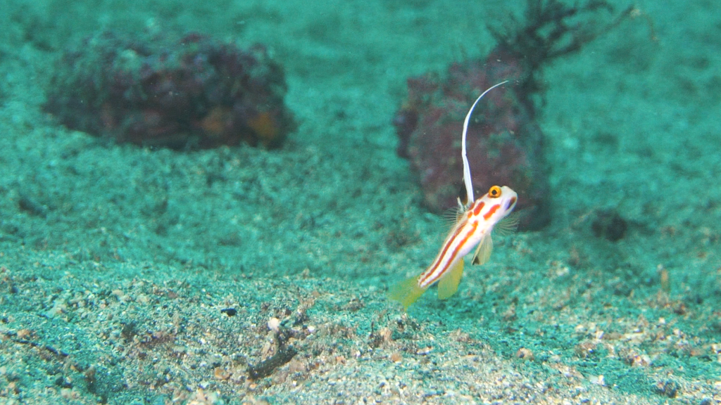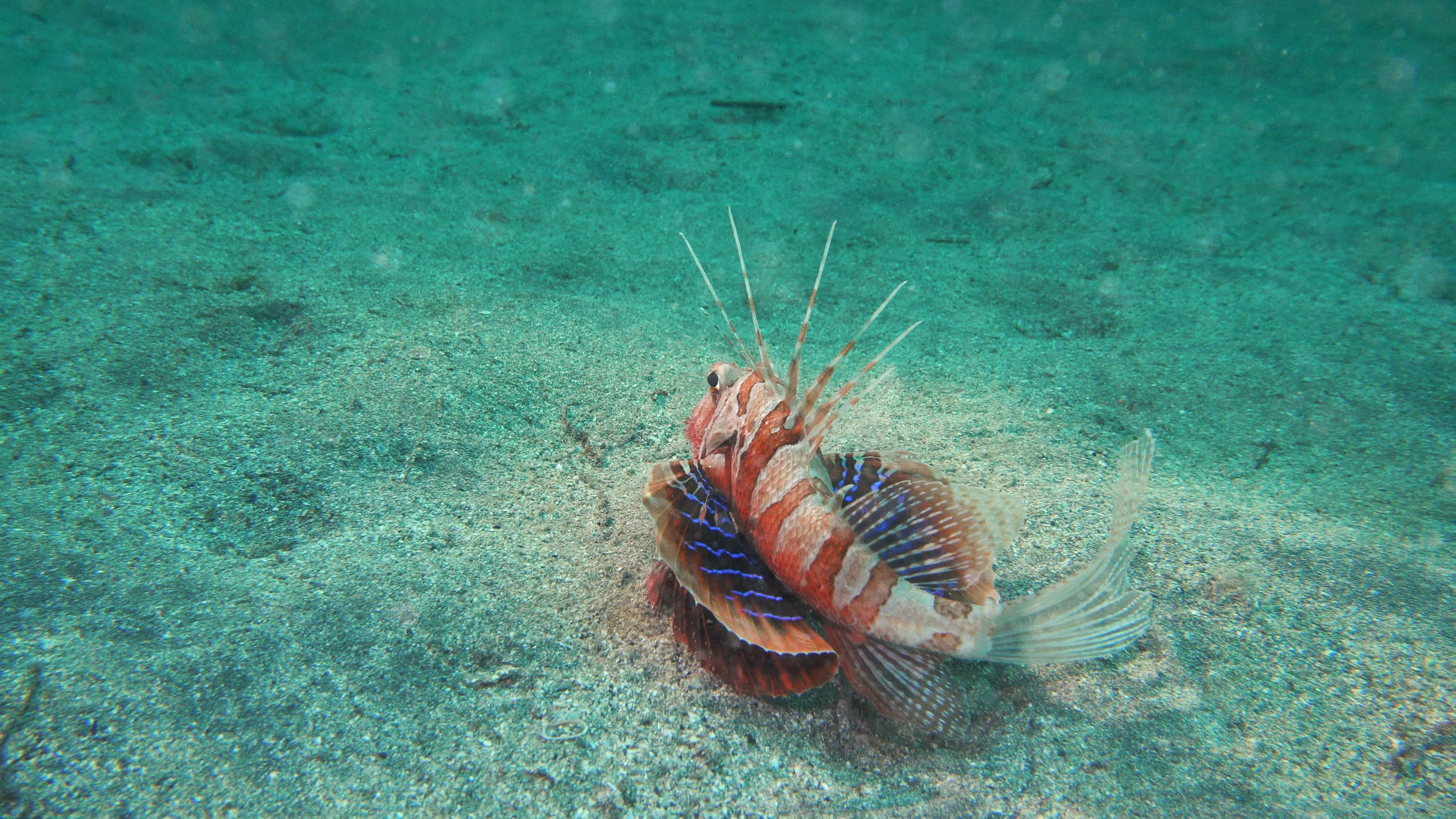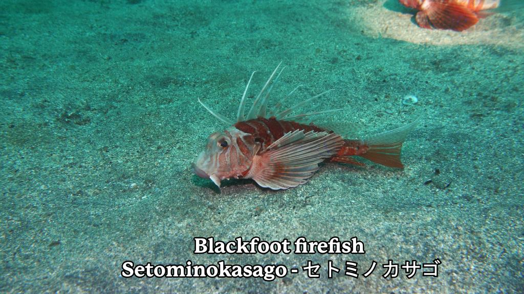 Further along the seabed, we found these weirdos. They are called blackfoot firefish. These creatures are lionfish relatives, but unlike other lionfish, they remain on the bottom and often bury themselves in the sand. The long spines on their back are venomous, so you definitely don’t want to touch them! But they do have these beautiful blue pectoral fins that fan out like peacock feathers.