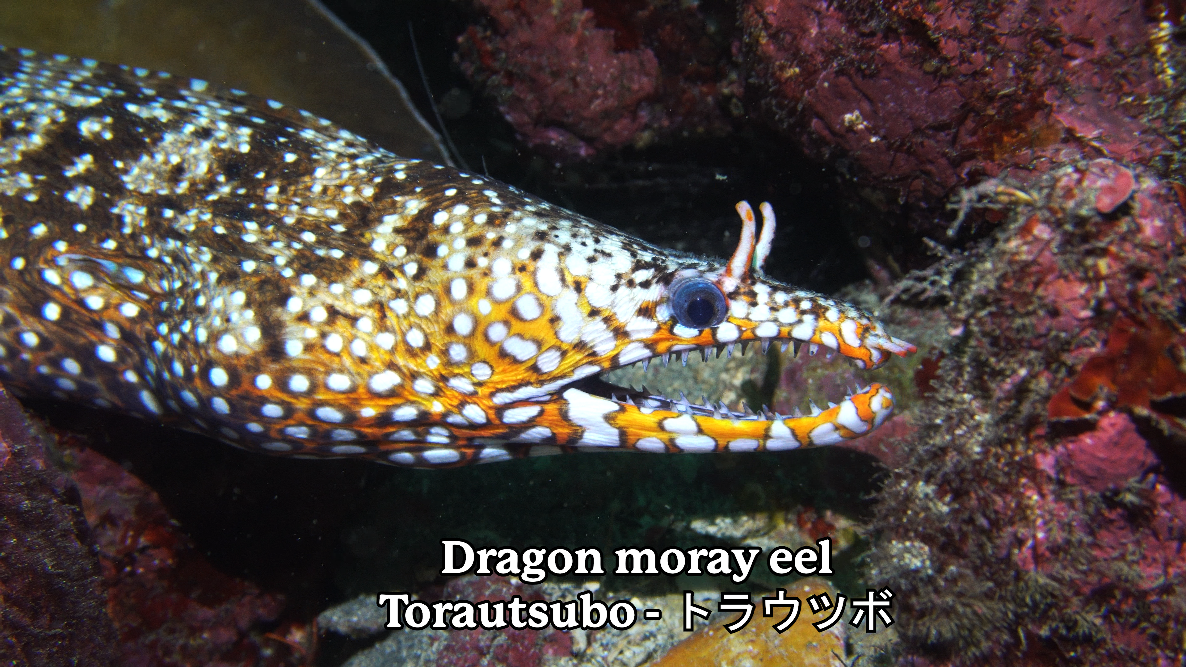 The dragon moray, on the other hand, is a true eel. Unlike typical morays, the dragon moray has curved jaws that prevent it from closing its mouth but allow it to grip and hold prey. It’s quite a magnificent animal, and I’d say it’s my favorite Japanese sea creature.