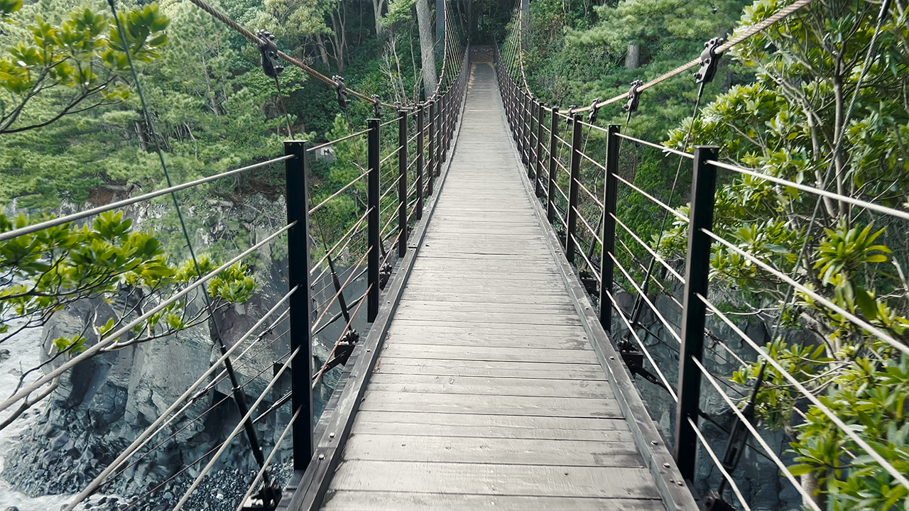After spending some time decompressing at the waterfalls, we hiked a little further until we reached a suspension bridge. This bridge is known as Hashidate suspension bridge, and it had some incredible views of the basalt cliffs and the azure ocean waters.