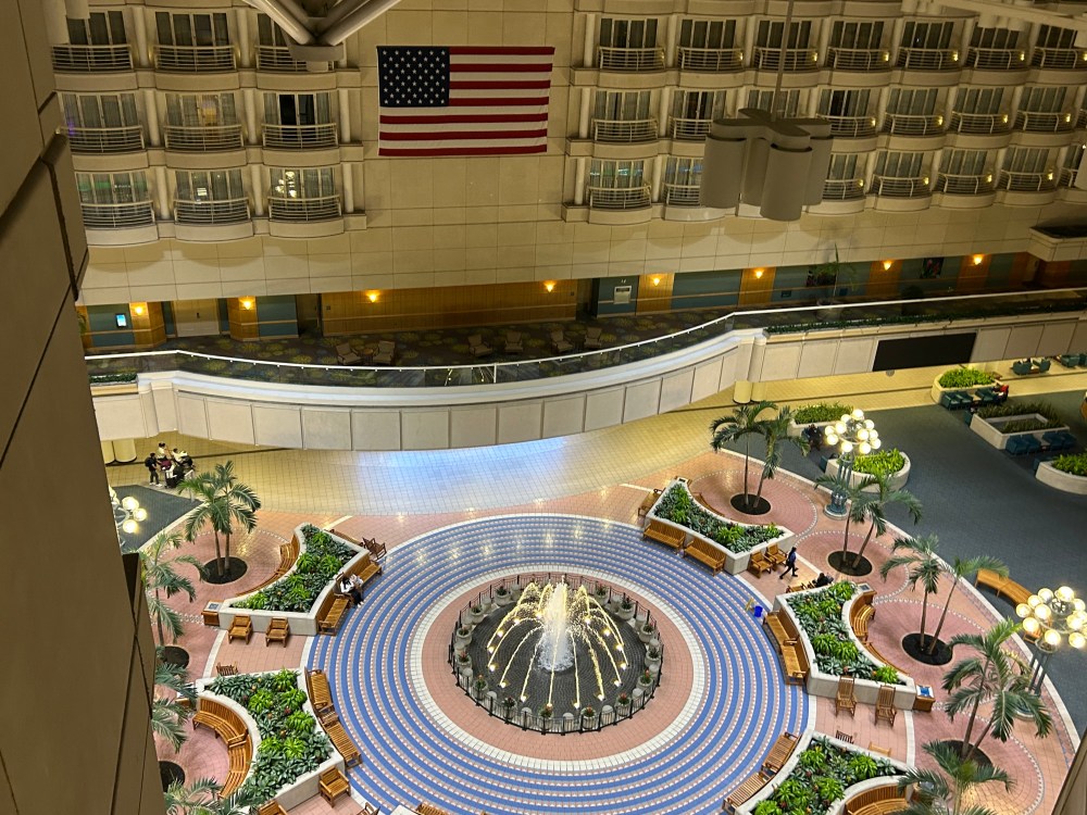 But, compared to the scary backrooms, the vibes here were chill. I’d never stayed in an airport hotel before, but this one was actually pretty sick. From our floor, we got nice views of a mini-park with a fountain located inside the airport’s main building between terminals A and B. It’s definitely not a tropical beach, but it’s waaaaay better than slouching in a chair in one of the terminals.
