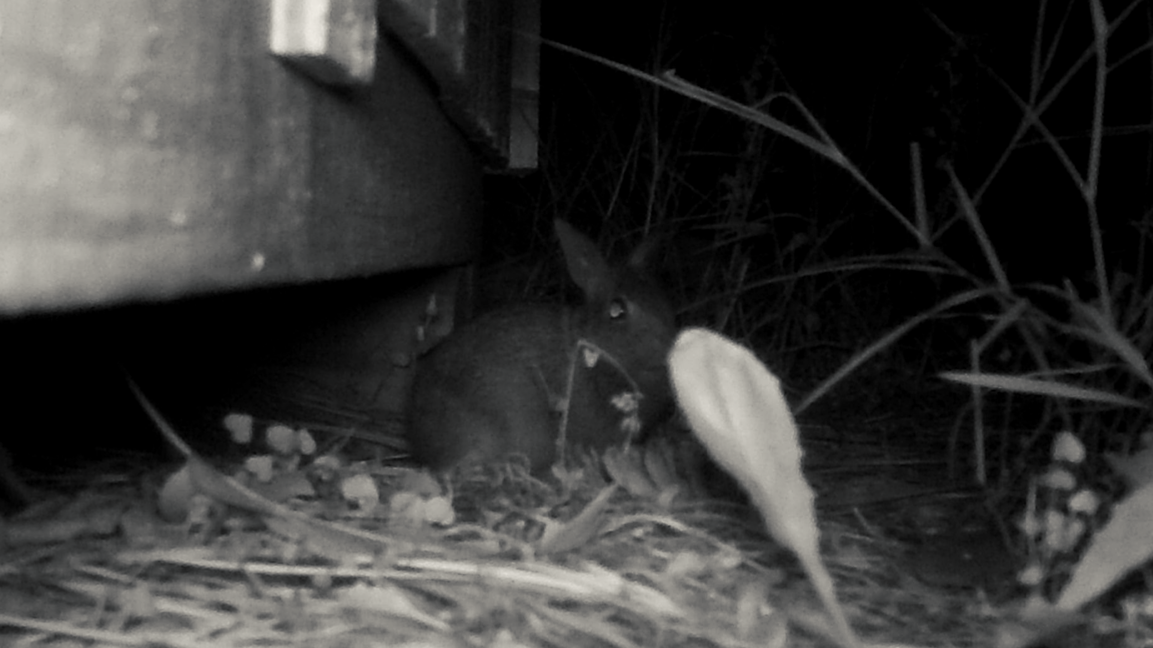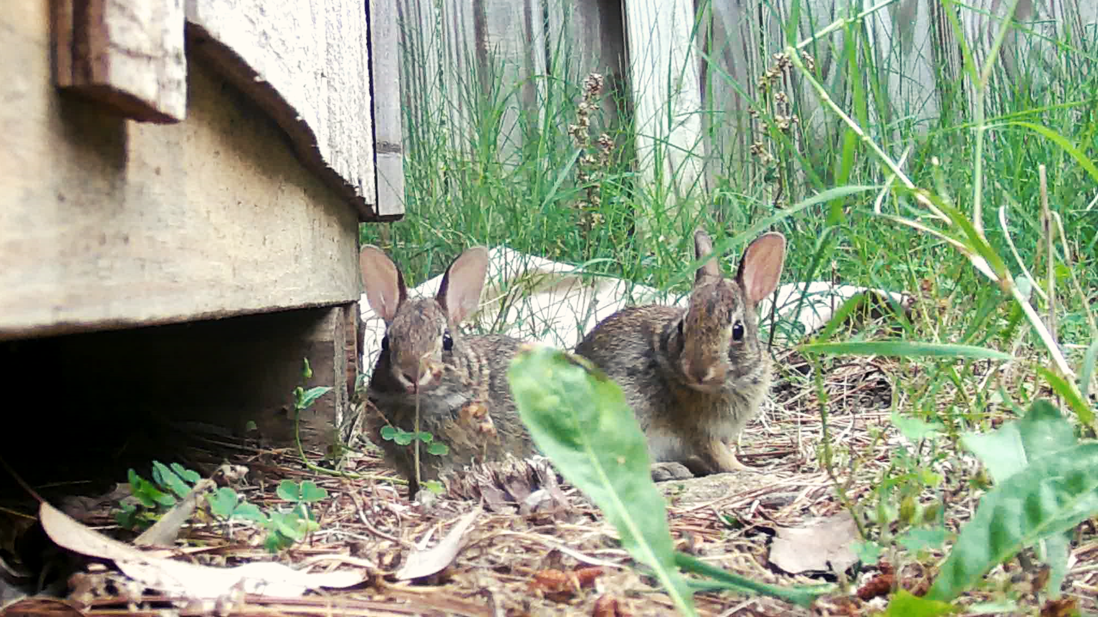 On the last few days we saw the bunnies, they became targets for two calculated predators. At night, a ravenous opossum caught their scent and followed their trail through the grass. Soon, it discovered them under the shed and attempted to ambush them while they slept. In a flash, one of the bunnies darted out from under the shed, and the opossum chased it.