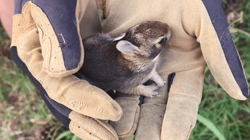 When baby bunnies are born, they are blind and hairless. Within a week, they grow fur and open their eyes. The babies we found were literally bright eyed and bushy tailed, so they were probably, at least, one week old. During this stage, their little ears are folded back, and they usually have a white blaze on their forehead called a “milk spot”.