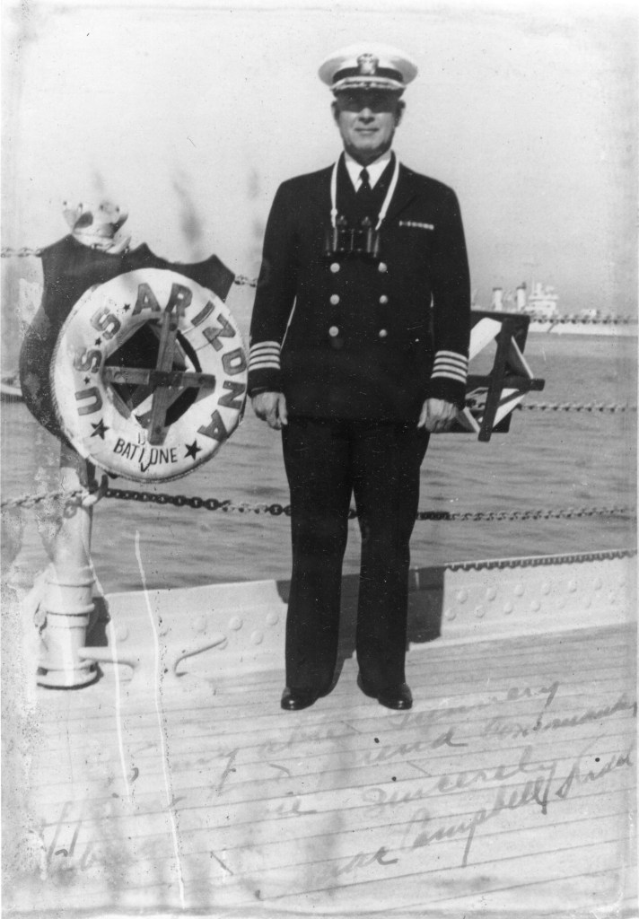 With Admiral Kidd and other high ranking officers down, Lieutenant Commander Samuel G. Fuqua, who was the ship’s Damage Control Officer and first lieutenant, became the Arizona’s highest ranking officer. Early in the attack, he had been knocked unconscious by a bomb at the ship’s stern, but once he came to, he led the firefighting and rescue efforts. These actions earned him the Medal of Honor, the highest American military decoration.