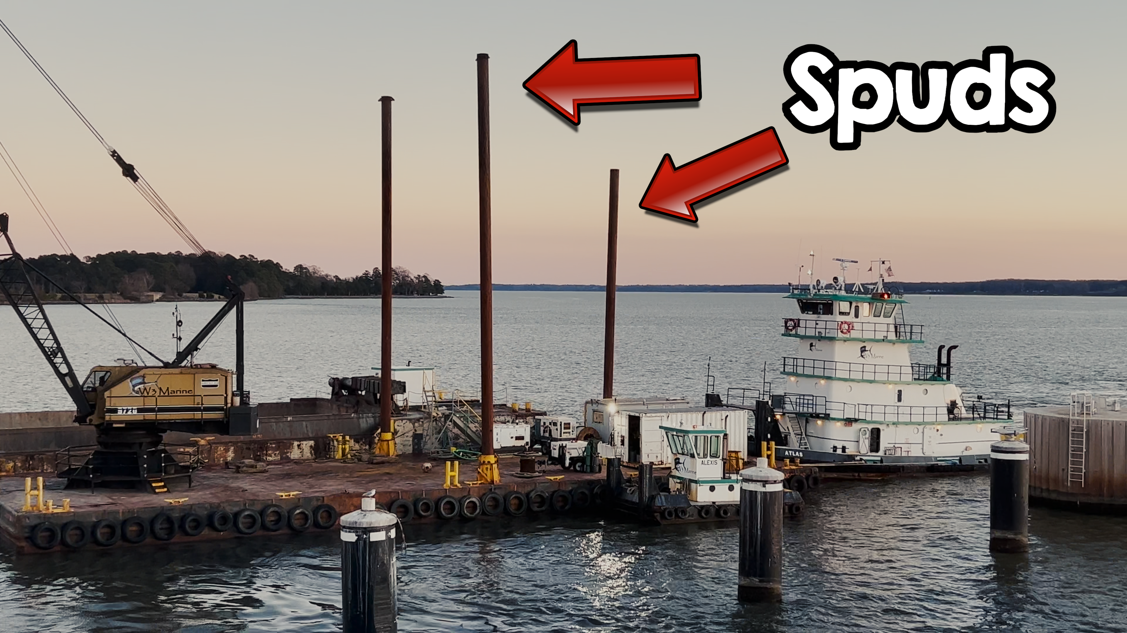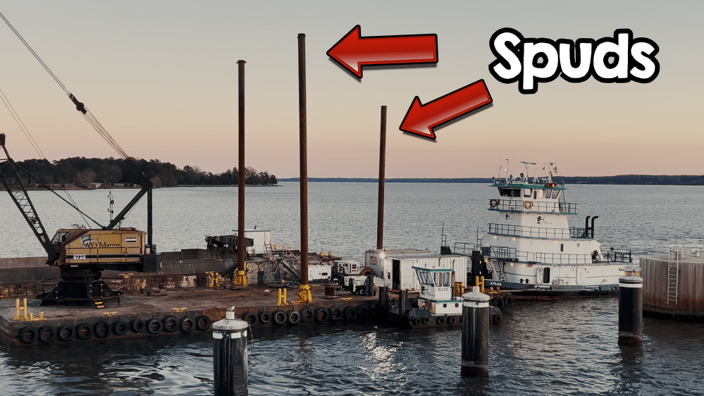 Today, mama tug is pushing around a pair of dredge barges. One barge has the crane used to dig up mud from the river and make the channel deeper for ships. This barge has tall pipes called “spuds” that it drives into the riverbed to keep the barge from floating away.