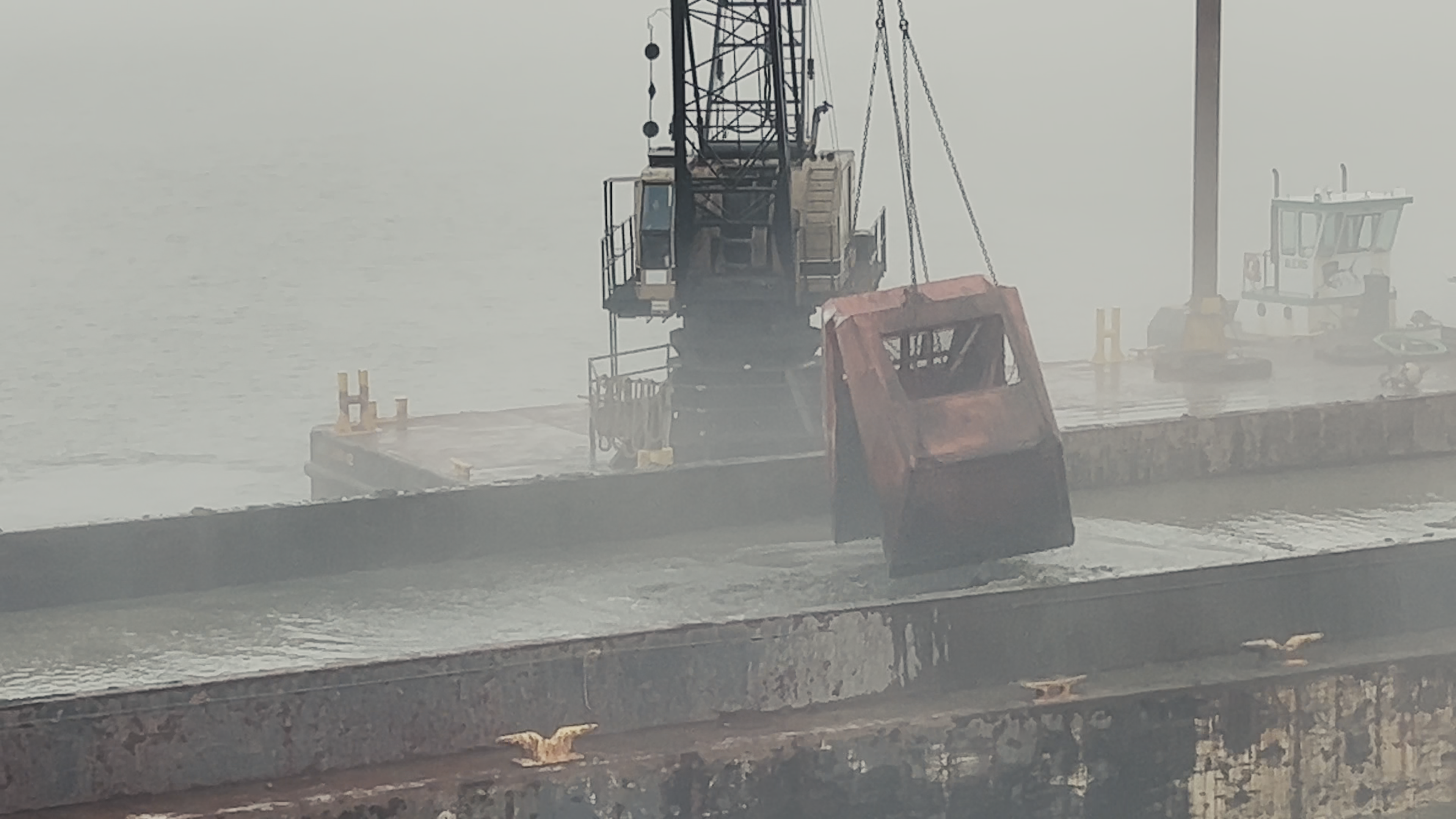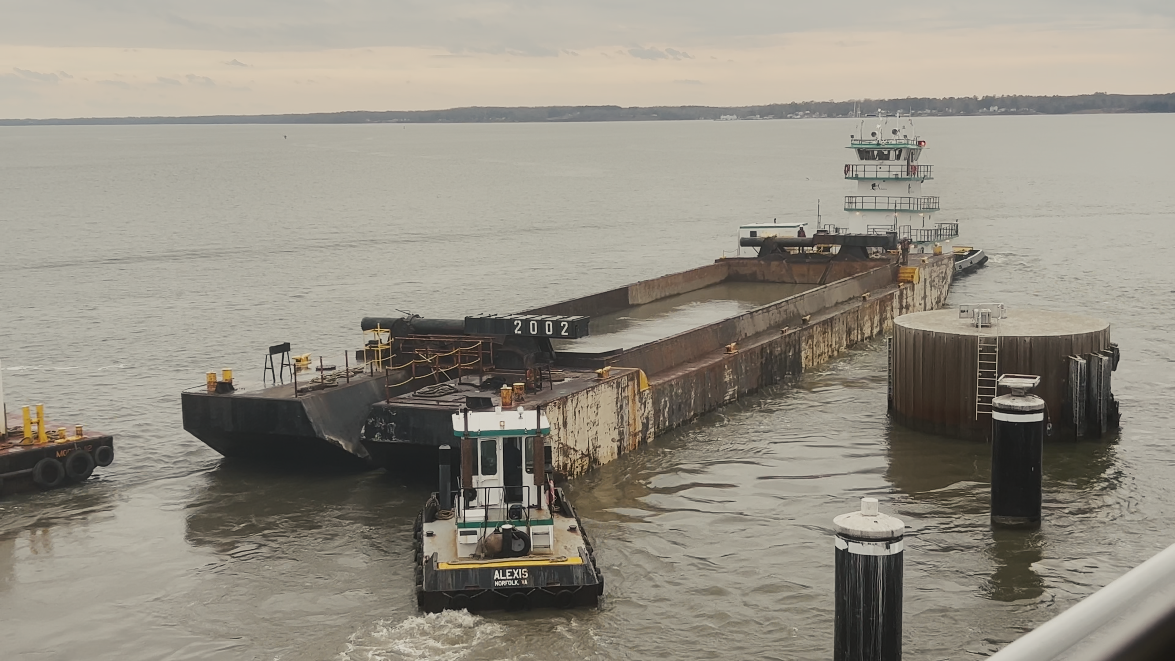 Once she’s done, she brings the empty barge back, and baby tug is ready to help again. In the wind and current, the barge can be difficult to handle, so baby tug jumps into action and pushes the hopper barge against the crane barge.