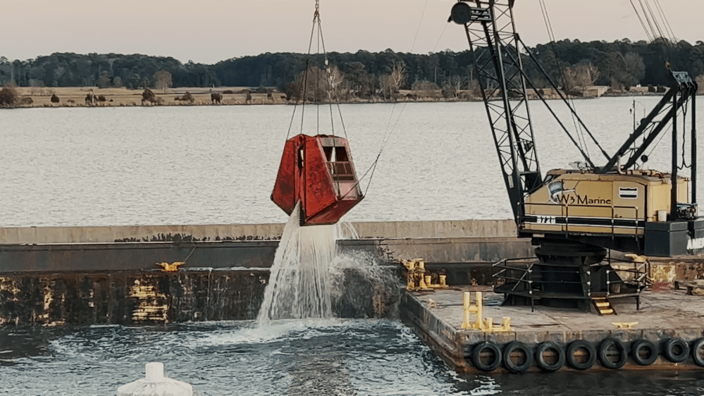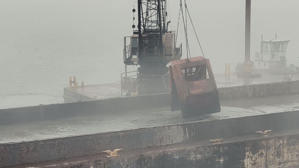 The crane has a grabbing bucket that works like those claw machines you see in arcades. It drops this “claw” to the riverbed, grabbing the mud and dumping it into the other barge. This other barge is called a hopper barge.